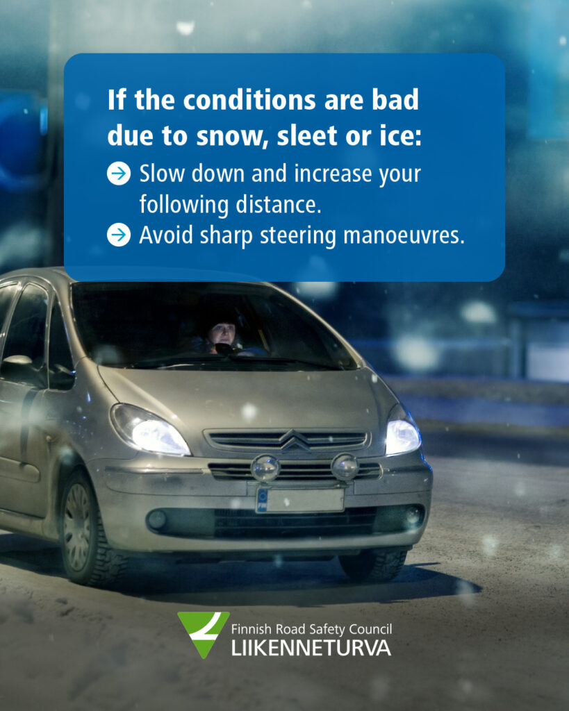 - Snow, sleet and ice can cause extremely dangerous road conditions in Finland. Slow down and increase your following distance if the weather is bad. Make sure you drive with lights on.